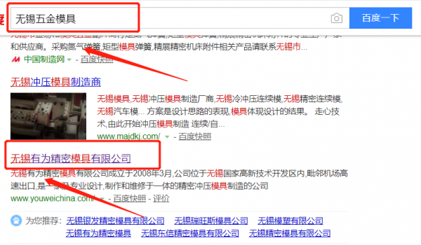 無錫有為精密模具有限公司用我司企業(yè)五金模具的網(wǎng)站優(yōu)化產(chǎn)品,其SEO關鍵詞有五金模具。一對一定制服務,產(chǎn)品經(jīng)理在線支持,無憂售后,適用于各個企業(yè),提供一站式網(wǎng)絡營銷服務。百度搜索引擎優(yōu)化,提升品牌關鍵詞的正面內(nèi)容信息展現(xiàn),體現(xiàn)良好的口碑宣傳。無錫有為精密模具有限公司成立于2008年,是經(jīng)無錫市市場監(jiān)督管理局審核的有資質(zhì)的公司,其統(tǒng)一社會信用代碼:91320214567833281C。公司地址:江蘇省無錫市新吳區(qū)梅村新風路60號。