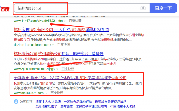 我們公司與杭州*昊紡織科技有限公司合作中,對這個公司所經(jīng)營的墻紙這個行業(yè)提供了關鍵詞搜索排名,與該公司的合作,更多的客戶讓我們公司為其提供關鍵詞搜索排名,通過每一次合作,我們公司不斷完善自己,同時希望合作伙伴在經(jīng)營的路上越來越好。